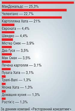 В следующем году украинские фаст-фуды отметят десятилетний юбилей. С открытием в 1997 году первого украинского МакДональдса в Украине началось становление современного рынка быстрого питания. Спустя год появились первые отечественные сети. Кроме фаст-фудов западного образца, таких как МакДональдс или «Мистер Снек», в стране обосновались заведения с национальной кухней украинское «Швидко» и турецкая «Гурме», а также закусочные с ключевым продуктом «Блин Клинтон», «Печена картопля». ДОЛИ РЫНКА СЕТЕВЫХ ОПЕРАТОРОВ быстрого обслуживания по количеству заведений Сегодня только в Киеве насчитывается не менее 120 заведений быстрого обслуживания, а по всей Украине их более 300. Назвать точное количество фаст-фудов эксперты не берутся, поскольку практически все фаст-фуды зарегистрированы как кафе, объясняет Ольга Насонова, генеральный директор компании «Ресторанный консалтинг». Украинская классификация общепита не разделяет заведения на фаст-фуды, кофейни, пиццерии, пивные и т. д. Тем не менее, по оценке специалистов Ресторанного консалтинга, на долю заведений быстрого питания приходится не менее 30% всего украинского рынка общепита. Обороты последнего посчитать легче. В 2005 году в ресторанах, кафе, барах и закусочных украинцы оставили более $2,2 млрд, из которых на долю ресторанов быстрого питания пришлось около $700 млн. К концу нынешнего года, по данным Ресторанного консалтинга, емкость этого сегмента вплотную приблизится к $1 млрд, достигнув $945 млн. Более оптимистичный прогноз дает директор по маркетингу Fast Food Systems (ТМ «Картопляна Хата», «Пи